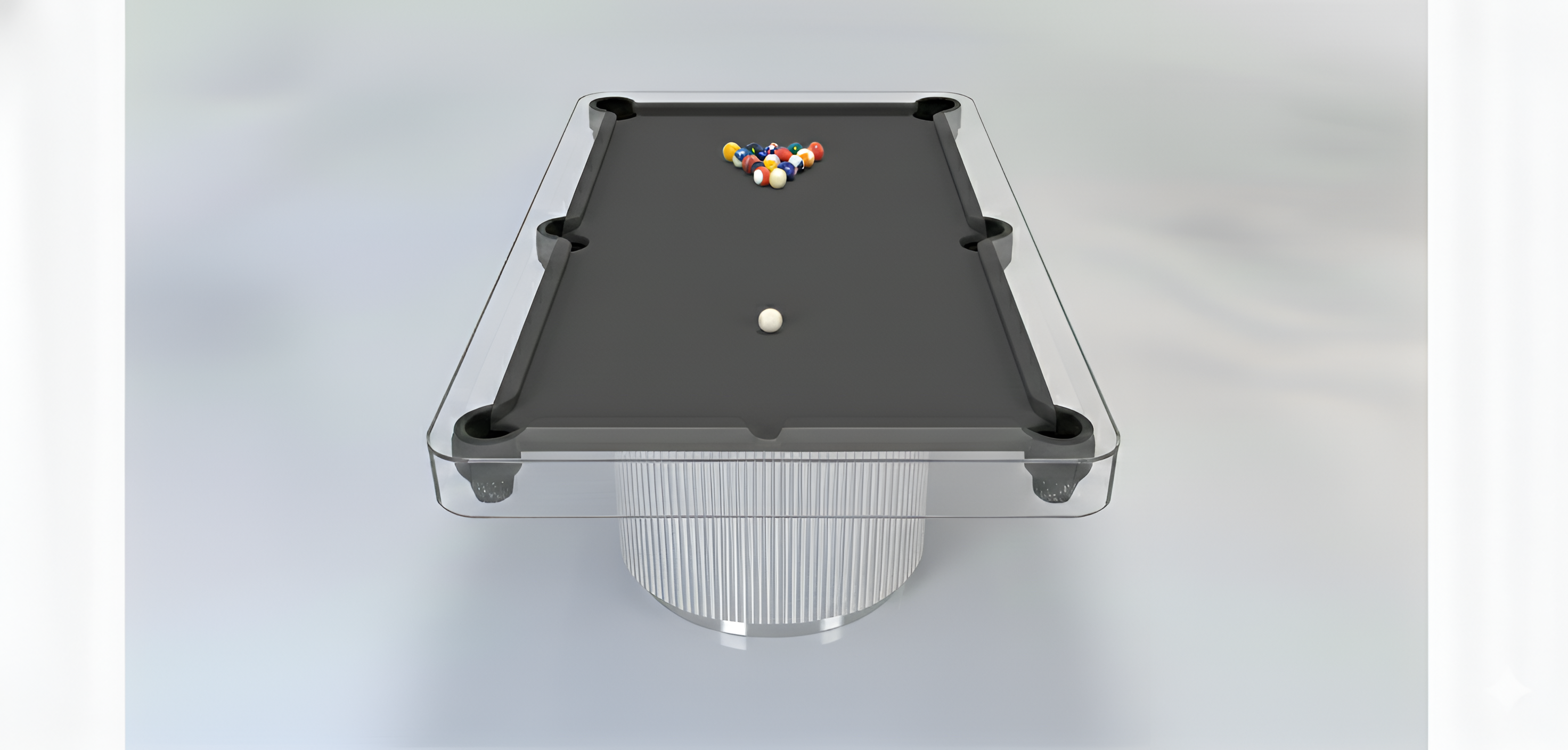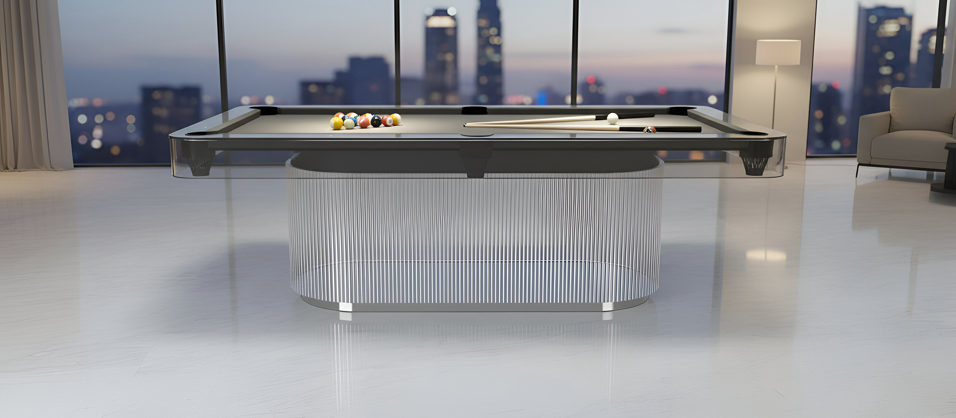 The Finnley acrylic glass billiards table redefines the boundaries of game aesthetics. Featuring our signature high-clarity acrylic apron, this table offers an unobstructed view of the games architecture. Built for the modern enthusiast, it replaces traditional bulky cabinetry with a floating silhouette. Every detail, from the pockets style to the professional- grade slate bed, is designed to offer a world class playing experience without compromising its minimalist DNA.